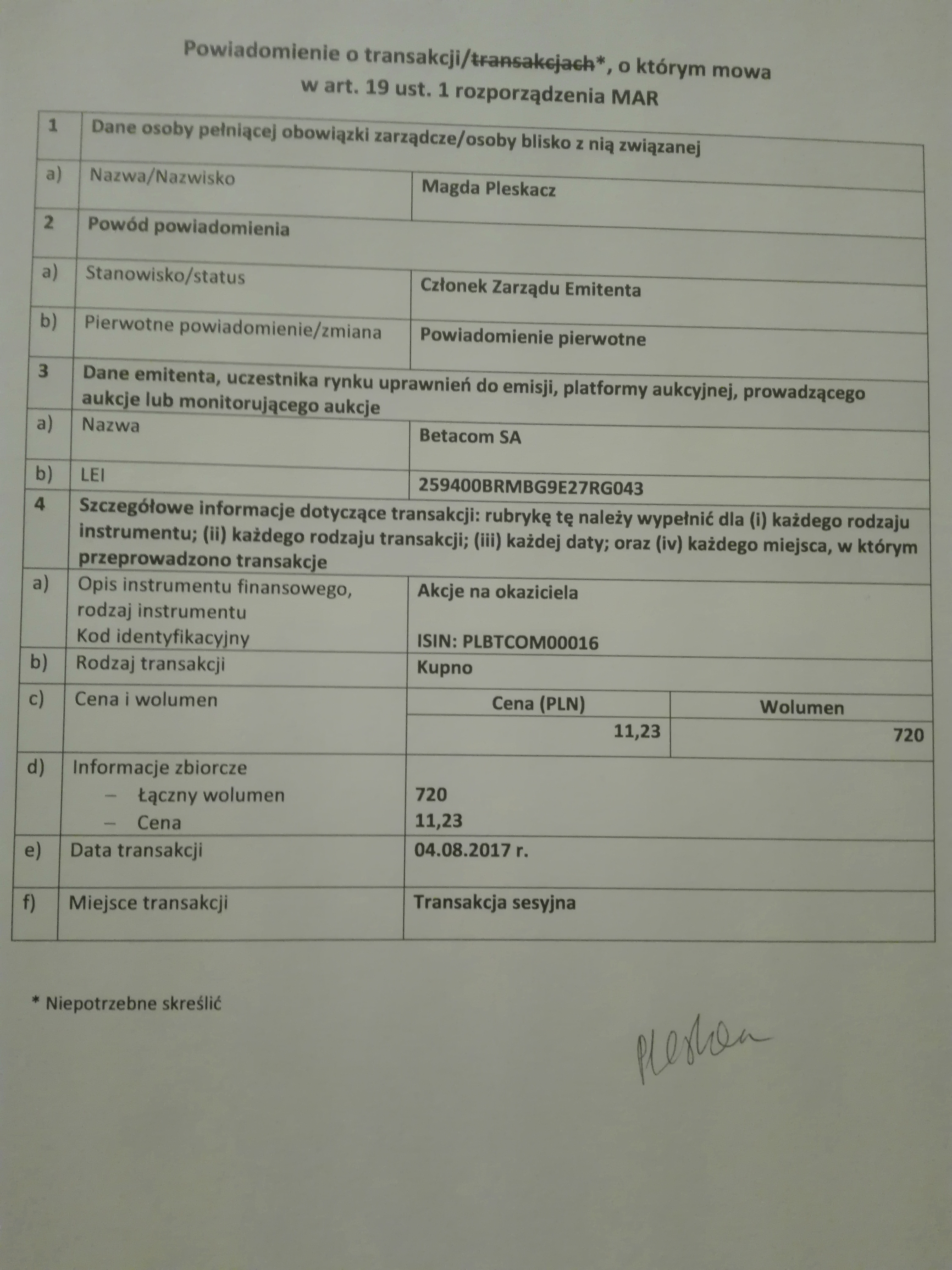 | Zarząd Betacom S.A. ("Spółka", "Emitent") informuje, że w dniu 8 sierpnia 2017 roku otrzymał zawiadomienia na podstawie art. 19 ust. 1 Rozporządzenia Parlamentu Europejskiego i Rady (UE) nr 596/2014 z dnia 16 kwietnia 2014 r. w sprawie nadużyć na rynku ("Rozporządzenie MAR") od Pani Magdy Pleskacz - Członka Zarządu Spółki. Zgodnie z zawiadomieniami Pani Magda Pleskacz poinformowała, że w dniach 4 sierpnia, 7 sierpnia oraz 8 sierpnia 2017 roku nabyła akcje Spółki. Emitent przekazuje w załączeniu pełną treść otrzymanych zawiadomień. | |||||||||||
