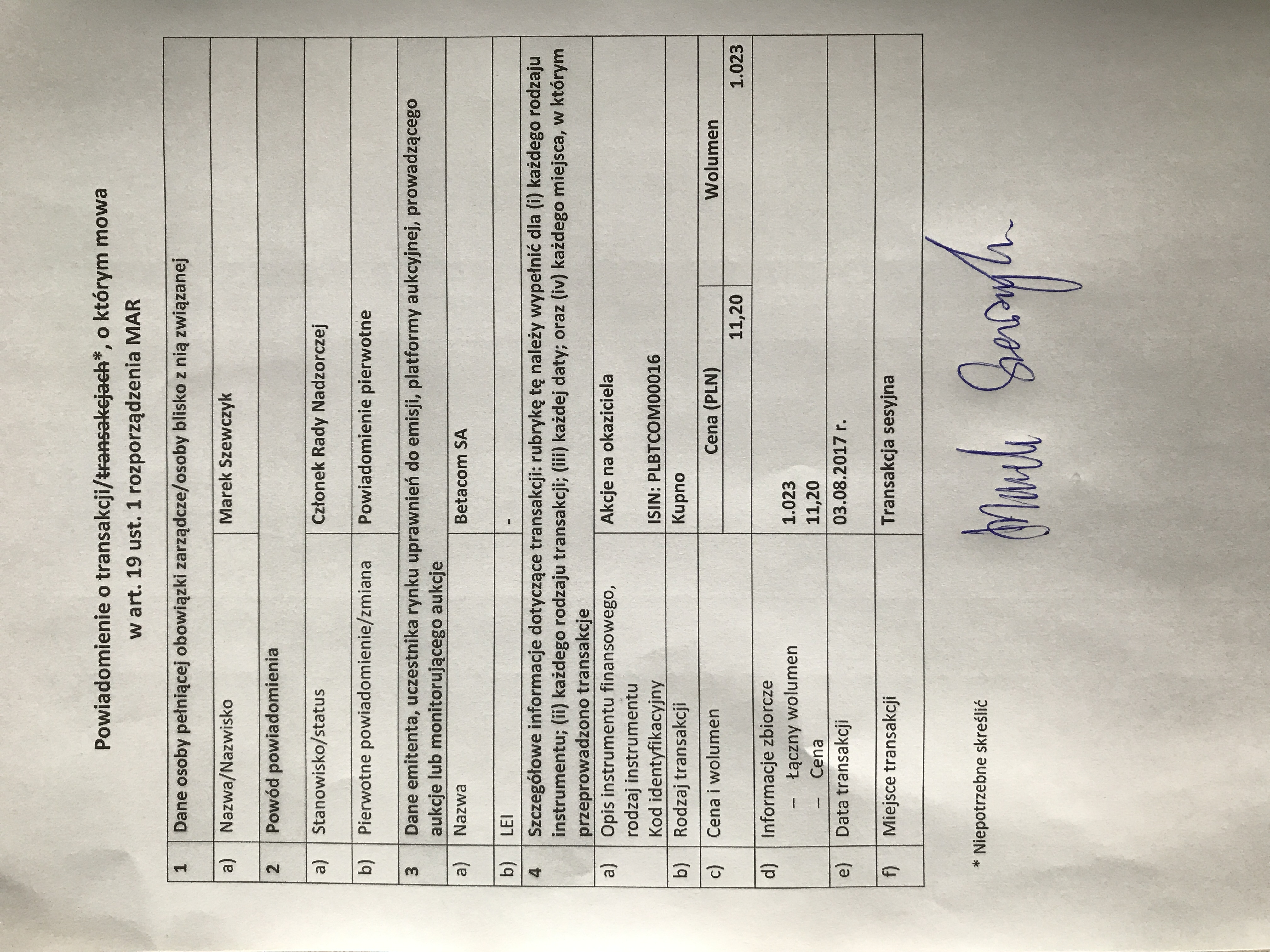 | Zarząd Betacom S.A. ("Spółka", "Emitent") informuje, że w dniu 3 sierpnia 2017 roku otrzymał zawiadomienie na podstawie art. 19 ust. 1 Rozporządzenia Parlamentu Europejskiego i Rady (UE) nr 596/2014 z dnia 16 kwietnia 2014 r. w sprawie nadużyć na rynku ("Rozporządzenie MAR") od Pana Marka Szewczyka – Członka Rady Nadzorczej Spółki. Zgodnie z zawiadomieniem Pan Marek Szewczyk poinformował, że w dniu 3 sierpnia 2017 roku nabył akcje Spółki. Emitent przekazuje w załączeniu pełną treść otrzymanego zawiadomienia. | |||||||||||