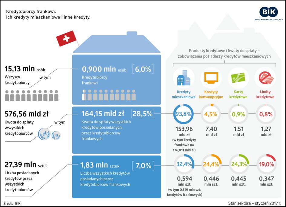 Kredyty walutowe obecnie występują w ofercie banków w coraz mniejszym stopniu, dotyczy to również zobowiązań w szwajcarskiej walucie. Bazy BIK, zawierające informacje o 15,13 mln kredytobiorców w Polsce, odnotowują obecnie 6% udział osób spłacających zobowiązania we frankach. Kwota do spłaty wszystkich kredytobiorców bez względu na walutę wynosi w przeliczeniu na złote 576,56 mld zł, z czego 164,15 mld zł to wartość do spłaty wszystkich rodzajów kredytów posiadanych przez kredytobiorców frankowych. Liczba wszystkich kredytów posiadanych przez frankowców wynosi 1,83 mln szt., co stanowi 7,0% spośród 27,39 mln szt. kredytów obsługiwanych przez wszystkich Polaków łącznie.