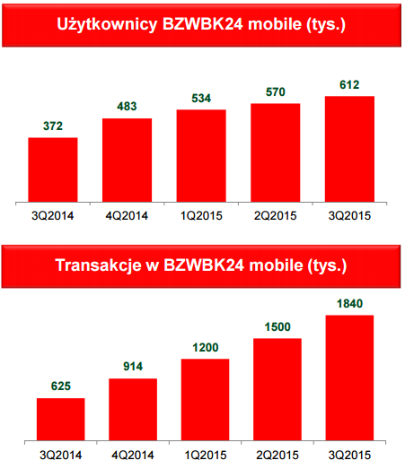 W tym samym czasie nastąpił silny wzrost liczby użytkowników korzystających z elektronicznych kanałów. Dziś bank ma 1,7 miliona aktywnych użytkowników BZWBK24 Internet, którzy w trzecim kwartale wykonali 35,7 miliona transakcji. Za pośrednictwem tego kanału bank sprzedał 38,7 tys. produktów kredytowych w III kw. W porównaniu do danych sprzed roku jest to wzrost o 81 proc.