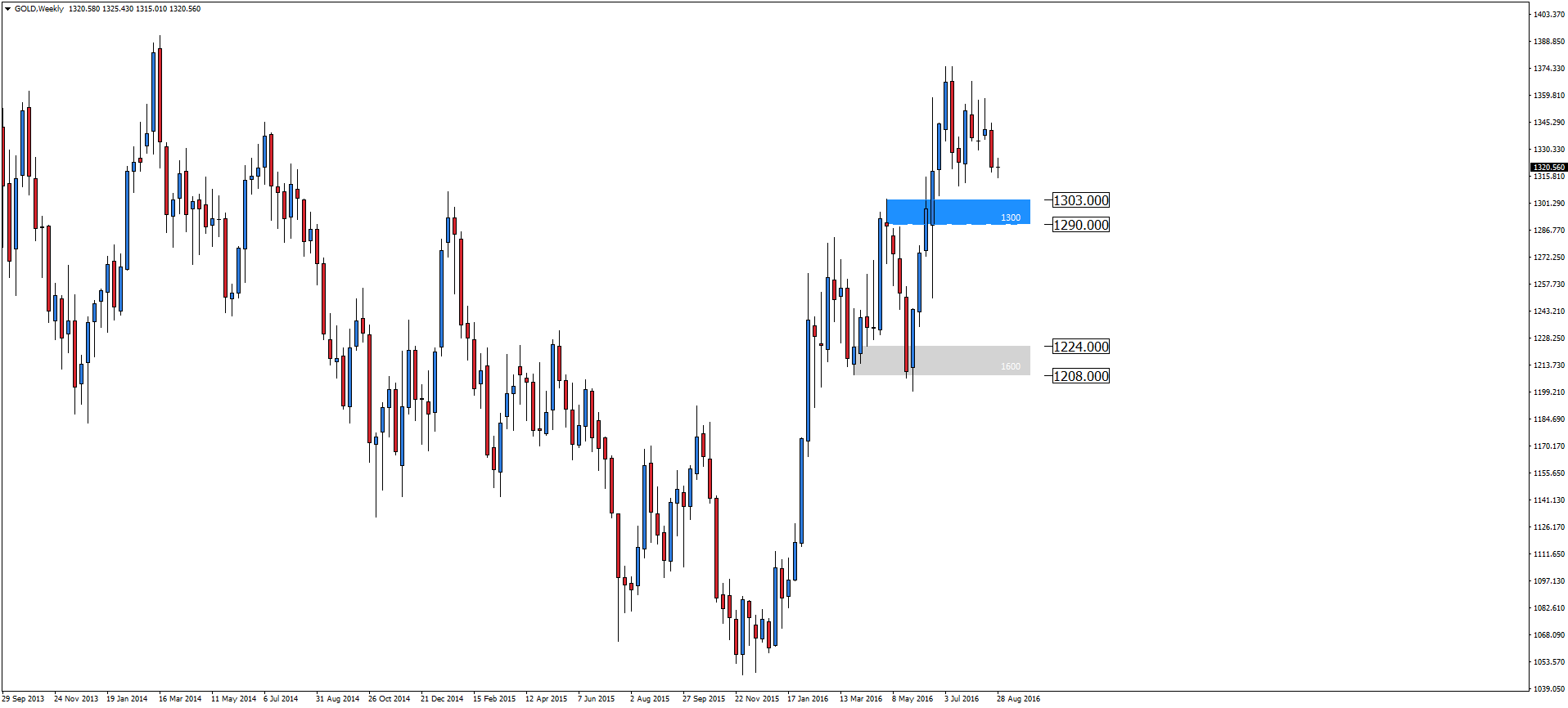 Spoglądając na wykres tygodniowy malejące zakupy złota ze strony banków centralnych powinny doprowadzić do korekty, która jest jak najbardziej zasłużona. Bazowym scenariuszem pozostanie spadek cen kruszcu w okolicę poziomu 1300. Gdyby wspomniany poziom został pokonany, to celem sprzedających może okazać się strefa popytu 1208-1224. Złoto jest krótkoterminowo drogie, jednak nie zmienia to faktu, że jest to początek długoterminowego trendu wzrostowego.