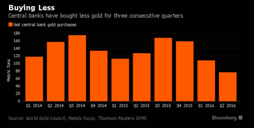 W II kwartale 2016 zakup złota przez banki centralne spadł o 40% porównując do analogicznego kwartału poprzedniego roku. Według danych z Bloomberga jest to najniższy poziom od 2011 roku. Ponadto jest to trzeci, spadkowy kwartał z rzędu, gdzie banki centralne ograniczają swoje zakupy, jest to najdłuższy okres od co najmniej 5 lat.