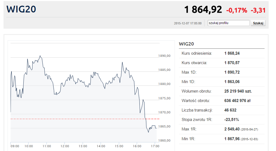 Ostatecznie WIG20 zakończył dzień 0,17% pod kreską. Słaba postawa blue chipów pociągnęła w dół cały rynek, ponieważ mimo niewielkich wzrostów na mWIG-u i sWIG-u, WIG zamknął poniedziałek 0,06% stratą. Obroty wyniosły 751 mln zł.