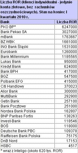 Na koniec pierwszego kwartału br. banki uniwersalne prowadziły blisko 22 miliony rachunków oszczędnościowo-rozliczeniowych (ROR) - wynika z danych zebranych przez Bankier.pl. To o 262 tys. więcej niż na koniec 2009 r. i o 1,5 mln więcej niż rok wcześniej. Wraz z bankami spółdzielczymi i SKOK-ami liczba ROR prowadzonych przez instytucje finansowe przekracza już 24 mln. W ciągu ostatniego roku najwięcej kont przybyło w Eurobanku (325 tys.), mBanku (244 tys.), Alior Banku (208 tys.), ING Banku Śląskim (175 tys.) i BZWBK (160 tys.). Najwięcej kont zamknęły natomiast Bank Millennium (217 tys.) i PKO BP (94 tys.). Kont osobistych przybywa w instytucjach, które aktywnie zabiegają o nowych klientów. Pewien wyjątek w tym gronie stanowi Eurobank, który dokłada bezpłatne RORy do innych produktów, które oferuje: kredytów i depozytów.