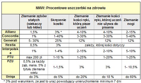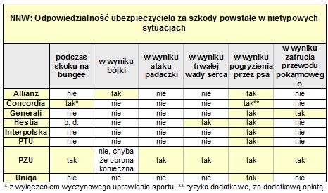 NNW niemal każdego z towarzystw uwzględnia ryzyko pogryzienia przez psa, trudno już jednak mówić o regularnym obejmowaniu pełną ochroną ubezpieczeniową dzieci z wrodzonymi wadami serca czy cierpiącymi na padaczkę. Ponieważ ubezpieczenie NNW z samej swej definicji chroni przez nagłymi i nieprzewidzianymi zdarzeniami, do których doszło bez winy ubezpieczonego, trudno będzie uzyskać odszkodowanie za złamany nos czy rozcięty łuk brwiowy, jeśli do urazów tych doszło w trakcie bójki. Jedynie Allianz i PZU nie wykluczają w tej sytuacji finansowego zadośćuczynienia, przy czym PZU pod warunkiem udowodnienia, że ubezpieczony wziął w niej udział w ramach obrony koniecznej. Ten fakt może być natomiast niezwykle trudny do zweryfikowania.