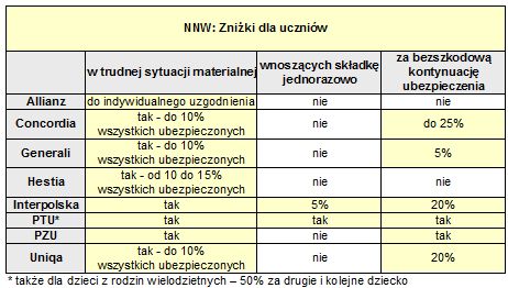 Nie wszystkie towarzystwa ubezpieczeniowe przygotowały dla swoich klientów ofertę w zakresie NNW, skierowaną konkretnie do dzieci i młodzieży szkolnej. Spośród poddanych analizie ofert, z powodzeniem można jednak dobrać produkt odpowiedni dla potrzeb dziecka. Jak zawsze na początku roku szkolnego, tak i w tym roku kuszące będzie zapłacenie jak najmniejszej składki, w związku z czym wielu rodziców sięgnie po ubezpieczenia z najniższymi sumami ubezpieczenia - w ofertach niektórych towarzystw może to być nawet 1 tys. zł. Warto przestrzec przed taką decyzją. Odszkodowanie stanowi procent sumy gwarancyjnej, dlatego w interesie ubezpieczonego jest nie zaniżanie jej. Na uwagę zasługują też dodatkowe świadczenia, pojawiające się w rozszerzonych wariantach ubezpieczeń – w razie poważnego urazu ciała, nieocenione okaże się pokrycie przez ubezpieczyciela kosztów specjalistycznego leczenia czy rehabilitacji. O odpowiednie NNW zadbać warto, mając na uwadze fakt, że tryb życia dziecka jest dość beztroski, a ryzyko wystąpienia nieszczęśliwego wypadku naprawdę znaczące.