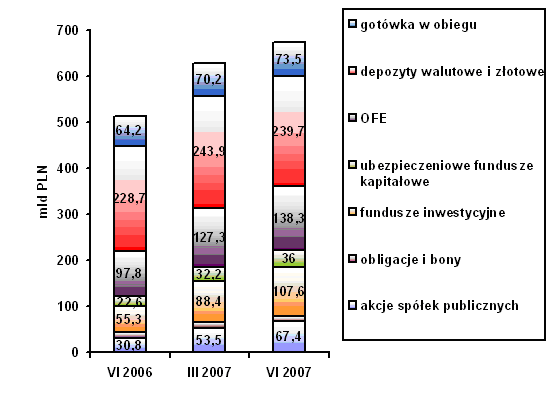W komentarzach ekspertów śledzących oszczędnościowe nawyki Polaków od lat przewija się ten sam wątek - rola depozytów maleje, a w ich miejsce coraz częściej sięgamy po akcje i jednostki funduszy inwestycyjnych. Chociaż trend ten jest widoczny wyraźnie już od przełomu wieków, to wciąż najprostsze bankowe produkty okupują pierwsze miejsce w strukturze oszczędności naszych rodaków. Co więcej, po latach, w których zaznaczył się spadek wartości depozytów w ujęciu nominalnym, od końca 2005 roku do początków 2007 roku dostrzegalny był niewielki, lecz stały ich wzrost. Ten niemal półtoraroczny okres napływu nowych środków do banków skończył się dopiero w drugim kwartale tego roku.Wartość i struktura oszczędności gospodarstw domowych (VI 2006 - VI 2007)