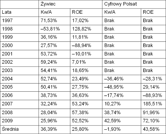 Tabela 5.3. Żaden konserwatywny inwestor nie chce, aby jego spółki wykazywały takie wartości Kw/A i ROE