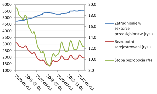Przybyło także bezrobotnych zarejestrowanych w urzędach pracy. Liczba poszukujących pracy wzrosła do 1.964,7 tys. osób wobec 1.953,2 tys. przed miesiącem. Ponadto w stosunku do minionego roku przybyło niemal 110 tys. bezrobotnych. Zatem na pierwszy rzut oka kondycja rynku pracy stale ulega pogorszeniu.