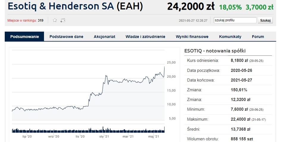 O 18 proc. drożeją na czwartkowej sesji akcje Esotiq & Henderson. Notowania spółki ustanowiły dziś trzyletnie maksima. Spółka w ubiegłym roku przełamała trwającą od 2018 roku bessę, jej akcje po wyznaczeniu historycznych minimów w kwietniu 2020 roku, w ciągu ostatnich 12 miesięcy podrożały aż o 150 proc.
