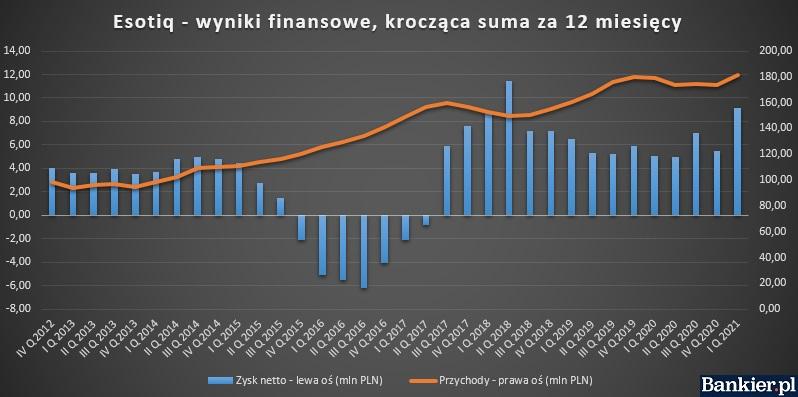 Warto zauważyć, że nie jest to pierwszy mocny raport spółki. Także wyniki za II i III kwartał 2020 roku były bardzo solidne. Oczywiście teraz można byłoby na pierwszy rzut oka nieco kręcić nosem, że wyniki są gorsze niż latem, warto jednak pamiętać o sezonowości i fakcie, że w I kwartale spółka nigdy dobrymi wynikami nie grzeszyła. A tym razem pokazała naprawdę solidny wynik. Widać to zresztą po odsezonowaniu wyników, czyli policzeniu 12-miesięcznej sumy. Tutaj Esotiq notuje obecnie historycznie najlepsze przychody. Zyski także są bliskie rekordowych.