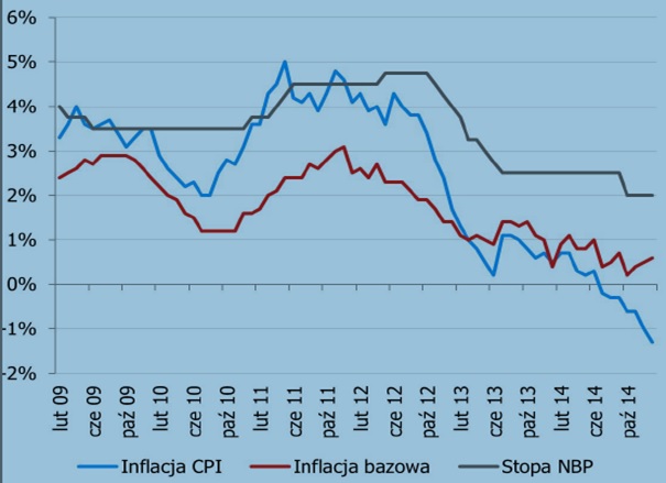 Tymczasem dane na temat styczniowej inflacji w Polsce ponownie rozbudziły oczekiwania na temat obniżki stóp procentowych. Zresztą zapowiedział to sam prezes NBP Marek Belka na konferencji po lutowym posiedzeniu. Jakie są argumenty za taką decyzją? Deflacja w styczniu pogłębiła się do poziomu -1,3% głównie za sprawą spadku cen żywności i paliw (wykres 1 - wzrost inflacji bazowej można wytłumaczyć efektem niskiej bazy na lekach). W pozostałych kategoriach dynamiki są w zasadzie zerowe i nie widać żadnej presji na odbicie cen. Wszystko wskazuje na to, że inflacja pozostanie na ujemnych poziomach znacznie dłużej niż prognozował NBP, a to będzie wymagać korekty projekcji inflacyjnej. W tym kontekście ważny jest również wydźwięk komunikatu RPP po lutowym posiedzeniu, który warunkuje dalsze luzowanie polityki pieniężnej tylko i wyłącznie wydłużonym okresem niskiej inflacji, a nie tak, jak poprzednio z uwzględnieniem perspektyw pogorszenia wzrostu gospodarczego. Dodatkowo, jak wynika z wypowiedzi członków RPP, widoczne jest „asymetryczne ryzyko umocnienia złotego w związku z działaniami ECB i napływem kapitału portfelowego".