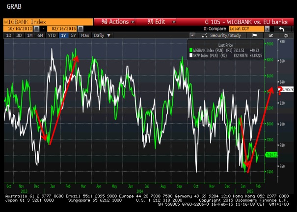 Zarówno decyzja ECB, jak i oczekiwana decyzja RPP to teoretycznie bardzo dobre wiadomości dla posiadaczy polskich akcji. Te jednak wciąż zachowują się relatywnie słabo na tle innych rynków, a przyczyny tej słabości są dość proste do zdiagnozowania. Rynkowi ciąży sektor bankowy, którego udział w indeksie WIG sięga około 30%. Zachowanie akcji polskich banków zwykle jest dość mocno skorelowane z zachowaniem sektora w Europie (wykres 2). Tymczasem od momentu podjęcia decyzji o uwolnieniu franka przez SNB i rozpoczęcia skupu aktywów przez ECB korelacja zanika. Akcje europejskich banków wyraźnie poszły w górę w czasie, gdy polskich biły rekordy słabości. Dlaczego? Przewalutowanie kredytów frankowych po kursie z dnia zawarcia umowy oznacza ogromne straty dla banków, ubytek kapitałów i ograniczenie akcji kredytowej na wiele miesięcy. Taki scenariusz pogrążyłby nie tylko banki, ale całą polską gospodarkę, a giełda warszawska w żaden sposób nie skorzystałaby ani na QE w Europie, ani na niskich stopach procentowych w Polsce. Zaciągnięcie niskooprocentowanego kredytu byłoby możliwe teoretycznie, ale w praktyce jego dostępność byłaby mocno ograniczona. Rozwiązania polityczne stawiają ponadto pod znakiem zapytania sens prowadzenia działalności gospodarczej w sektorze bankowym, bo w rzeczywistości zwalniają klientów banków z ponoszenia konsekwencji zawartych umów. Wyobraźmy sobie, że za klika lat pojawia się inflacja i stopa WIBOR rośnie do 10%. Czy wówczas pojawi się pomysł, aby klienci, którzy wcześniej zaciągnęli kredyty złotowe, płacili od nich odsetki obliczone na bazie WIBOR z dnia zawarcia umowy (np. 2%)? Jaki sens ma wtedy udzielanie kredytów przez banki? Może zamiast rozwiązań politycznych lepiej pozwolić, aby zmaterializowało się „asymetryczne ryzyko umocnienia złotego w związku z działaniami ECB i napływem kapitału portfelowego".