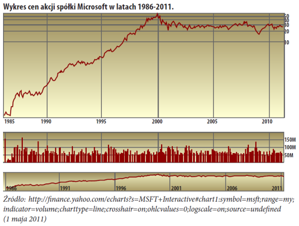 Microsoft zadebiutował na giełdzie w 1986 roku i uczynił z Billa, który był w posiadaniu 45% akcji, natychmiastowego milionera. Rok później założyciela firmy można już było zaliczyć do grona miliarderów. Wykres poniżej prezentuje ceny akcji Microsoftu od debiutu do dnia dzisiejszego.