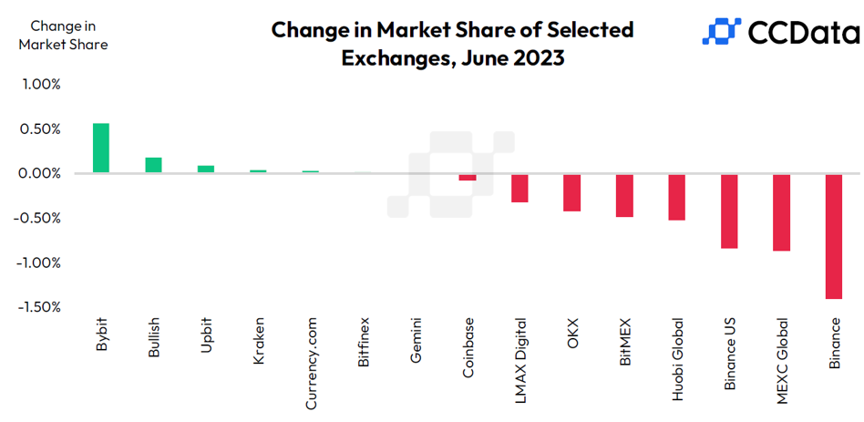 Według raportu CryptoCompare udział Binance w rynku kryptowalutowych transakcji spot spadł w czerwcu czwarty miesiąc z rzędu do poziomu 41,6%. To najniższa wartość odnotowana przez nią od sierpnia 2022 roku. Wolumeny giełdy zaczęły tracić w widoczny sposób od kwietnia, po pierwszym pozwie w USA ze strony CFTC. W następstwie pozwu SEC przeciwko Binance i Coinbase, na Binance.US zaobserwowano spadek wolumenu o 78%.