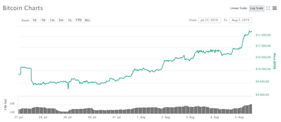 Wzrosty na najbardziej znanej cyfrowej walucie zbiegają się w czasie z kilkoma istotnymi wydarzeniami na tradycyjnych rynkach finansowych. Zaledwie w ostatnią środę amerykański bank centralny zdecydował o pierwszej od 2008 roku obniżce stóp procentowych. Decyzja była spodziewana, ale inwestorzy liczyli chyba na coś więcej ze strony szefa Fed. Prawdziwe turbulencje na rynkach wywołał jednak w czwartek pod wieczór Donald Trump, który w serii tweetów na nowo rozniecił wojnę handlową z Chinami, zapowiadając obłożenie importu z Państwa Środka do USA „małym”, dodatkowym cłem. Na rynkach zrobiło się wtedy nerwowo.