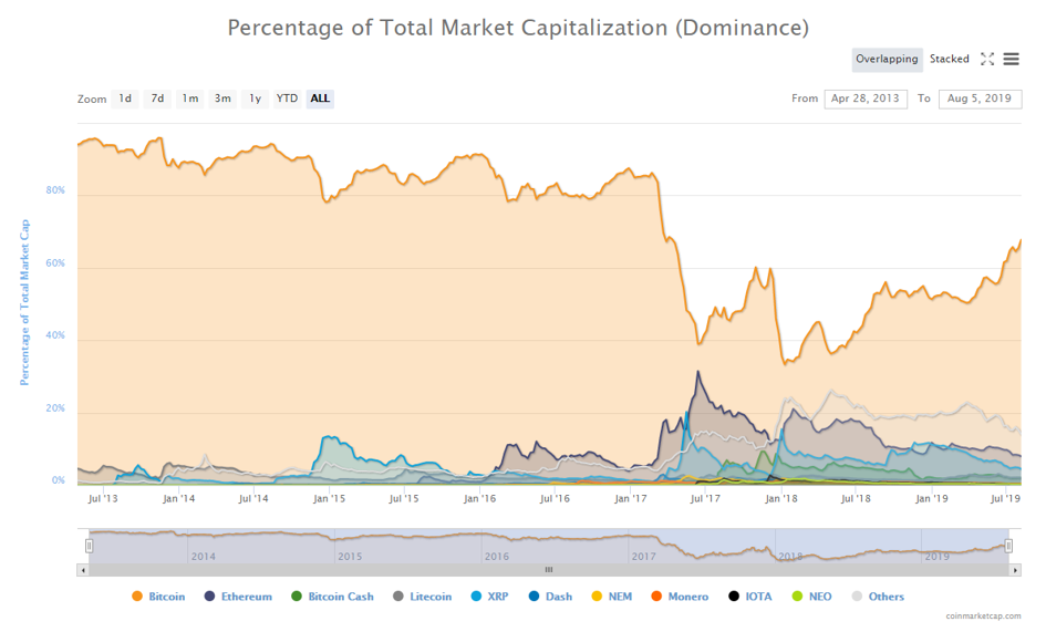 Jeśli tak dalej pójdzie, udział bitcoina w rynku może dojść od niewidzianego od ponad 2 lat poziomu 80 proc., kiedy to bitcoin był zdecydowanie głównym rozgrywającym na rynku kryptowalut. Dochodzenie do tego praktycznie monopolistycznego poziomu może wynikać z faktu, że rozwój produktów kryptowalutowych na tradycyjnych rynkach (np. kontrakty terminowe, inwestycje funduszy) opiera się w głównej mierze właśnie na bitcoinie.