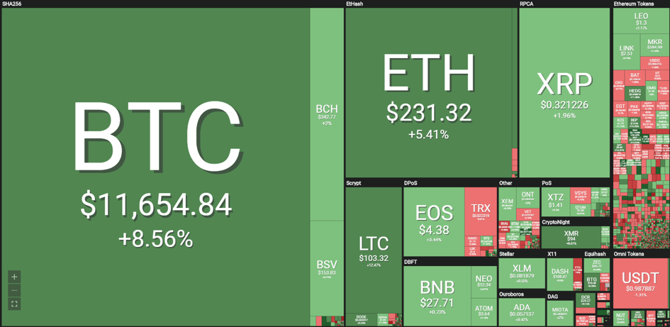 Lipiec był miesiącem oddechu i korekty dla notowań bitcoina. Pod koniec czerwca nagłym krachem zakończyła się superhossa na bitcoinie, która wyniosła kurs flagowego okrętu rynku kryptowalut do blisko 14 tys. dolarów, poziomu niewidzianego na rynku od blisko półtora roku. Sierpień przynosi tym czasem odrodzenie kursu cyfrowej waluty, który w ciągu ostatniego tygodnia wzrósł z lokalnego dołka w okolicach 9,1 tys. dolarów do poziomu 11 652 dolarów notowanego w poniedziałek około południa - wynika z danych serwisu Coin360. Zaledwie ostatnia doba przyniosła posiadaczom bitcoina zysk w wysokości blisko 9%.