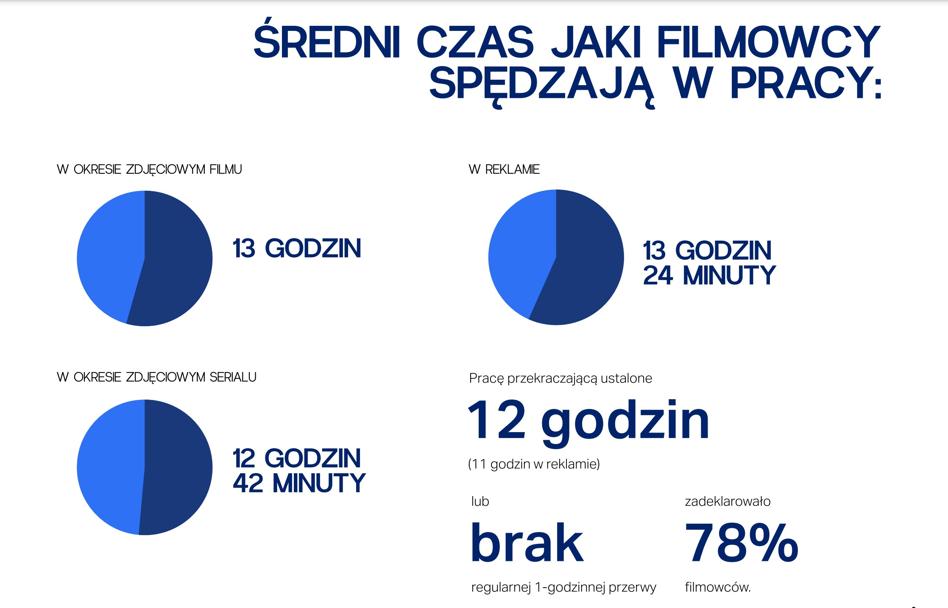 - około 70 proc. filmowców pracujących przy filmach deklaruje 1-godzinną przerwę we wszystkich dniach pracy,