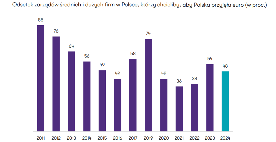 Autorzy badania przypominają, że na początku minionej dekady (czyli u progu kryzysu gospodarczego w strefie euro, po kryzysie zadłużeniowym w Grecji) oraz w 2019 roku (kiedy unijna waluta wyszła z kryzysu) skłonność polskich przedsiębiorców do wchodzenia do Eurolandu przez nasz kraj była bardzo wysoka. Za unijną walutą opowiadało się nawet ponad 85 proc. ankietowanych szefów średnich i dużych firm.