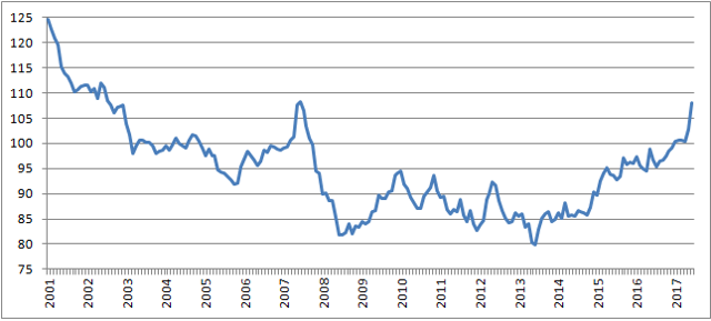 Obecna wartość indeksu znajduje się na najwyższym poziomie od czerwca 2007 r. Co ciekawe, wówczas rozpoczynała się kadencja Nicolasa Sarkozy'ego. Lokalny szczyt, choć na niższym poziomie (92 pkt.) wskaźnik wyznaczył także 5 lat później, kiedy urząd prezydenta V Republiki obejmował Francois Hollande.