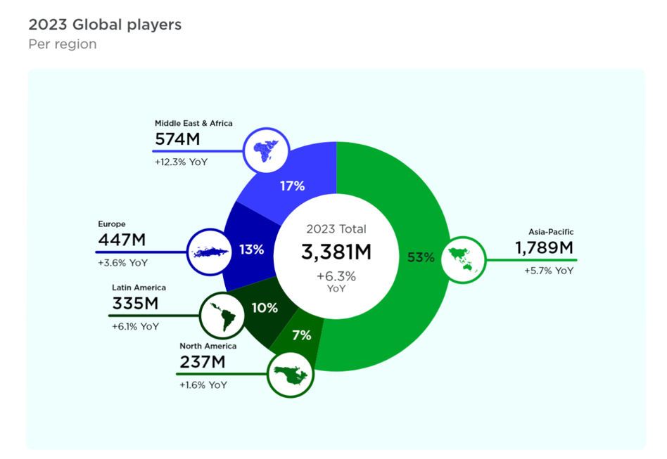 Największą dynamiką może pochwalić się region Bliskiego Wschodu i Afryki, który zaczyna się umacniać na drugim miejscu, jeszcze przyspieszając roczny przyrost graczy. Czynniki, które stoją za taką dynamiką ogólnoświatowego wzrostu, to przede wszystkim poprawa infrastruktury dostarczającej mobilny internet, jego rosnąca dostępność i przystępność cenowa oraz coraz większa klasa średnia.