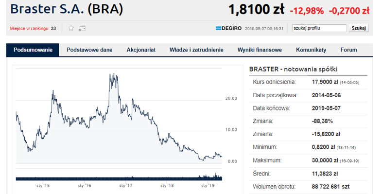 Braster zanotował w 2018 roku 19,8 mln zł straty netto wobec 24,9 mln zł straty rok wcześniej. Więcej o problemach spółki pisaliśmy w tekście "Rejterada rady nadzorczej. Problemy Brastera coraz poważniejsze". W artykule tym zwracaliśmy uwagę, że Braster może mieć problemy ze spłatą wspomnianych obligacji.