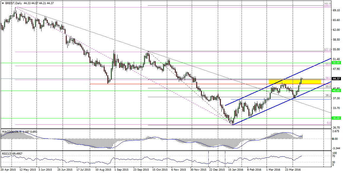 Wykres dzienny ropy Brent wybił się powyżej szerokiej strefy podaży 42,52-43,90 USD. Tym samym otwarta jest droga do górnego ograniczenia kanału wzrostowego w jakim ropa porusza się od połowy stycznia. Aktualnie znajduje się ono na poziomie 47,10 USD.