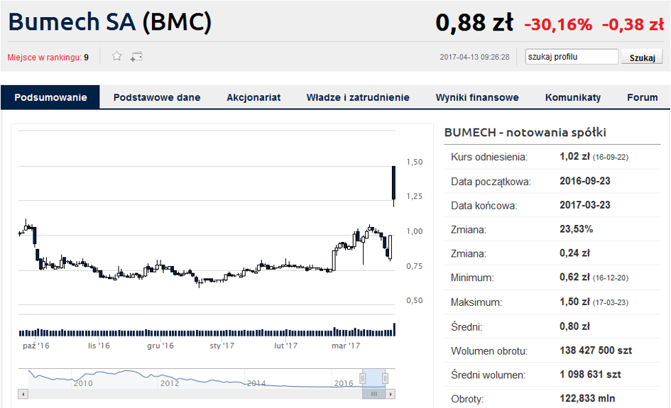 Po niespełna godzinie handlu za akcję Bumechu płacono 90 groszy – czyli o 28,57% mniej niż na zamknięciu notowań 23 marca. Spółka „otworzyła się” przy kursie 87 groszy, co oznaczało spadek o 30,95%. Taka reakcja rynku nie była zaskoczeniem – mniej więcej na tym poziomie przez poprzednie dni utrzymywał się teoretyczny kurs otwarcia.