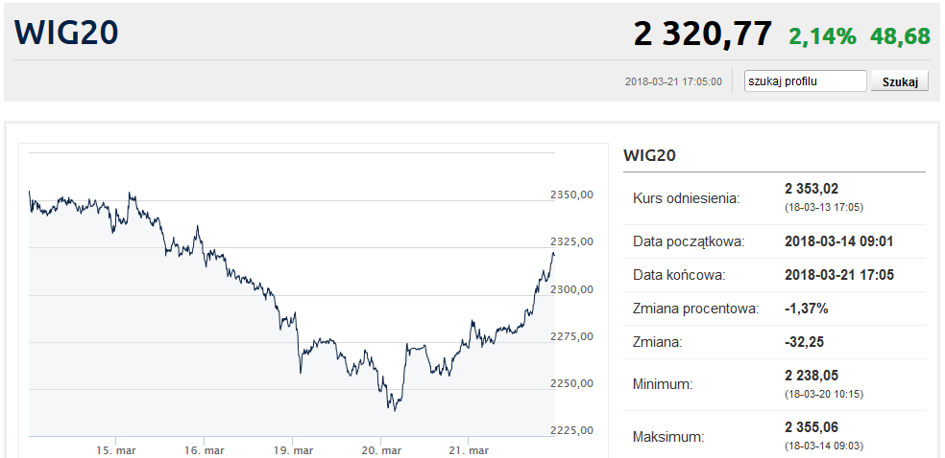 WIG20 zyskał dziś 2,14 proc., co było najwyższym dziennym wzrostem od 4 stycznia tego roku (2,84 proc.). Wynik na poziomie 2320,77 pkt. pozwolił powrócić do stanu z końca ubiegłego tygodnia.