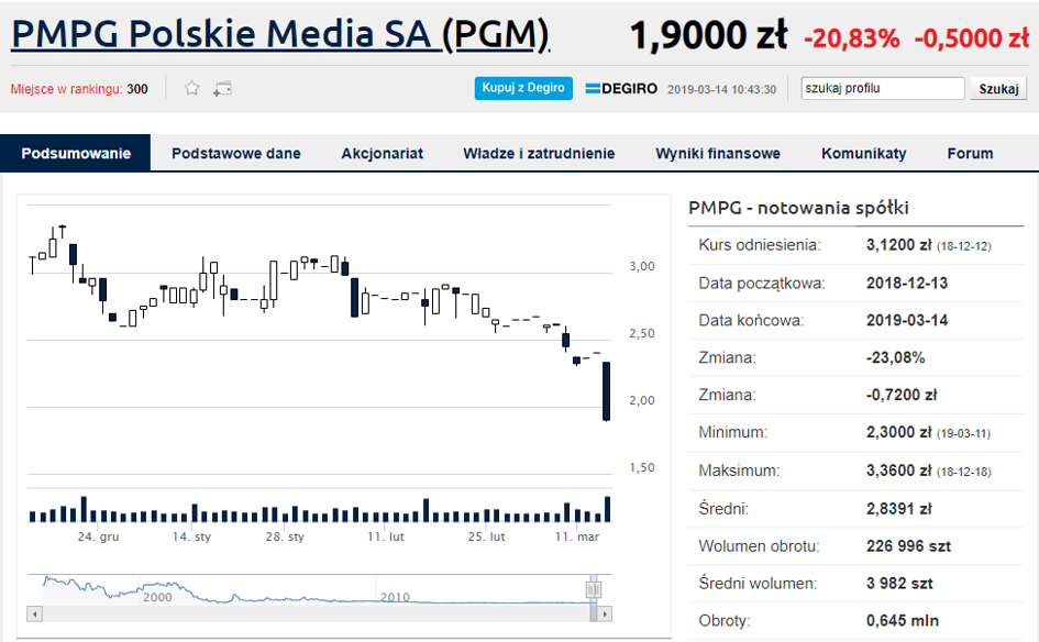 Na początku czwartkowej sesji notowania PMPG spadły o prawie 12% do poziomu 2,12 zł, po czym zostały zawieszone z powodu znacznej przewagi sprzedających. Po godz. 10 notowania ponownie ruszyły, kurs akcji pogłębił sesyjne minima do poziomu 1,95 zł, co oznacza spadek o blisko 19%.