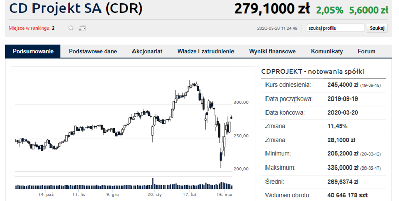 Akcji CD Projektu nie ominęła jednak przecena, między końcówką lutego a środkiem marca spółka straciła ponad 12 mld zł ze swojej kapitalizacji. Obecnie trwa jednak odbicie wspierane nie tylko poprawą nastrojów na światowych giełdach, ale także i doniesieniami, że gry w związku z akcją nieopuszczania domów przeżywają prawdziwy renesans. Na początku tygodnia platforma Steam poinformowała, że za jej pośrednictwem w gry grała największa liczba graczy w historii. Jako że był to okres bez większych premier, które mogłyby napędzić tak znaczący wzrost zainteresowania, sytuację szybko powiązano z koronawirusem.