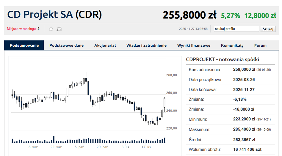 Jako że raport wynikowy został opublikowany po sesji, to właśnie w czwartek 27 listopada inwestorzy mogli zareagować na zaprezentowane wyniki. Rano kurs CD Projekt rósł o około 3 proc., ale odbiór raportu wynikowego można było uznać za zachowawczy przy skali pozytywnego zaskoczenia. Chłodem powiało jeszcze przed południem, kiedy za akcję CD Projekt płacono 240 zł, czyli o 1,2 proc. niżej od ceny zamknięcia sprzed publikacji.