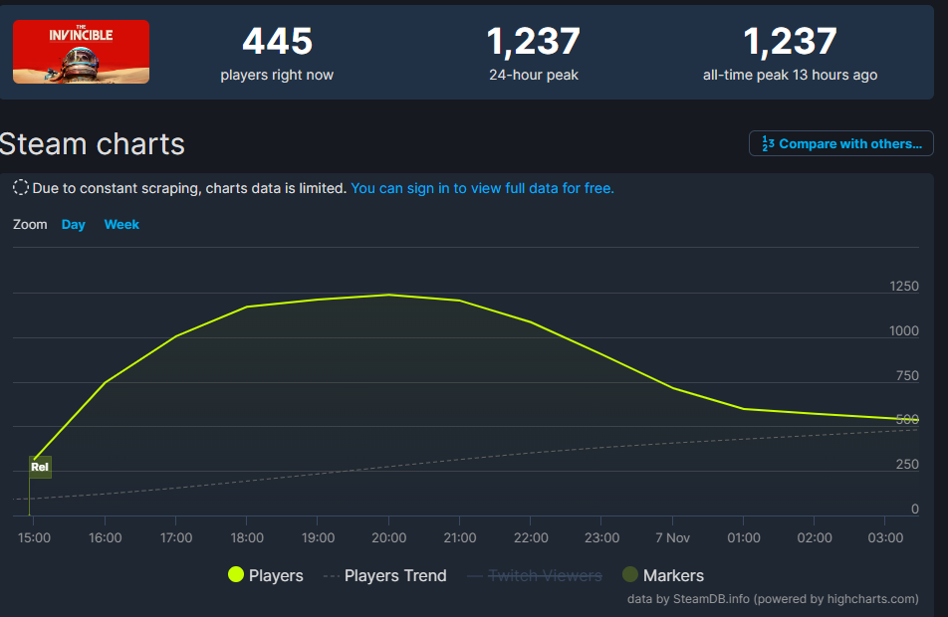 Słaby start sprzedażowy gry „The Invincible” obrazuje wykres z porannego raportu DM Trigon pokazującego peak graczy oraz szacowaną sprzedaż w pierwszy trzech dniach od premiery na przykładzie gier wydawanych przez PlayWay. Słaba prognoza sprzedaży jest widoczna gołym okiem i pojawiła się także w obniżonych oczekiwaniach domów maklerskich po premierze.
