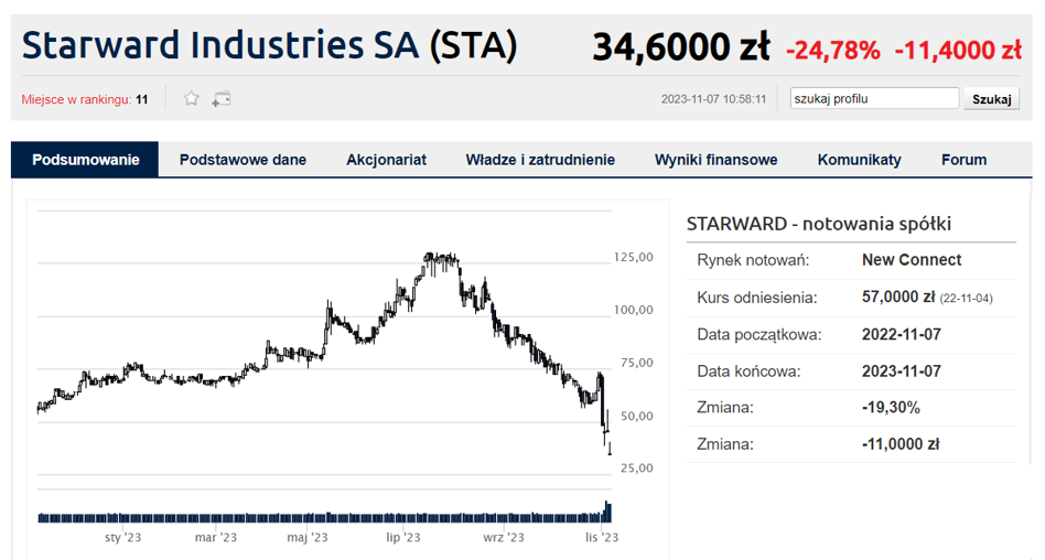 Kurs Straward Industries spadł we wtorek w czasie sesji o 34,7 proc. do 30,00 zł i był najniżej w historii. To także niżej od ceny akcji, z jaką spółka wchodziła w 2020 r. na NewConnect, gdy cenę odniesienia ustalono na 41 zł w nawiązaniu do poprzedzającej debiut emisji akcji.