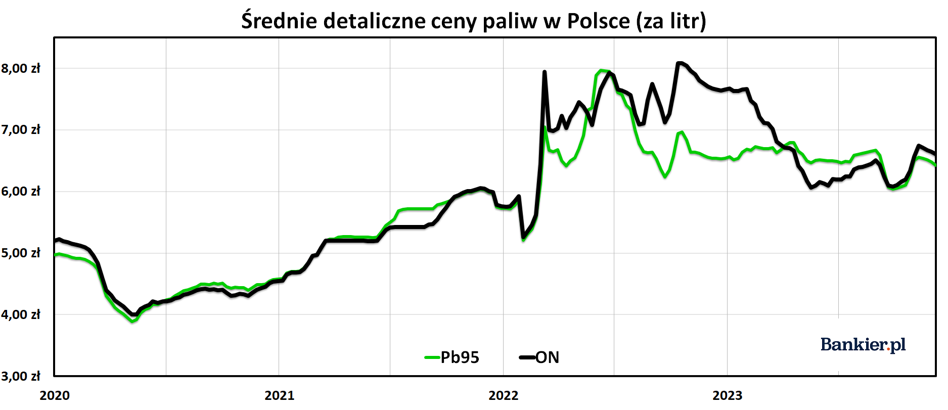 Na tym froncie mamy same dobre informacje. Kontrakty terminowe na benzynę na nowojorskiej giełdzie wyceniane są obecnie na ok. dwa dolary za galon. To najniższe stawki od grudnia 2021 roku! Dla porównania, w szczycie paliwowego kryzysu w czerwcu 2022 roku benzyna w NY była wyceniana na przeszło 4 USD/galon. Z kolei olej napędowy na londyńskiej giełdzie ICE notowany jest po 775 USD/t – a więc najniżej od lipca. Trzecią dobrą nowiną jest to, że złoty w relacji do euro jest najmocniejszy od marca 2020 roku, a dolar jest o blisko 10% tańszy niż rok temu.