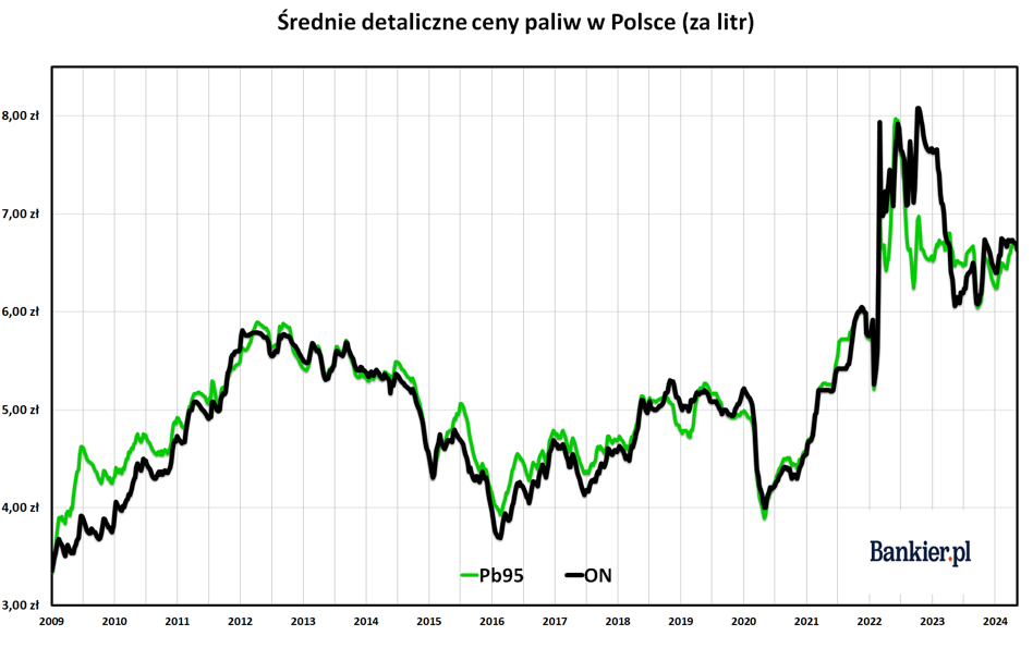 Niemniej jednak zarówno średnie ceny detaliczne Pb95 oraz ON są już wyższe niż rok temu. Benzyna jest obecnie o 16 groszy na litrze droższa niż w maju 2023 roku. W przypadku oleju napędowego różnica ta wynosi aż 58 gr/l. Zatem najprawdopodobniej w majowym odczycie inflacji CPI ceny paliw przestaną działać dezinflacyjnie.