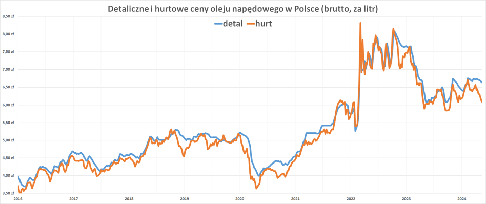 Kosmetyczne obniżki cen detalicznych kontrastują z wyraźnym spadkiem stawek hurtowych. 17 maja Orlen oferował benzynę Eurosuper 95 po 5 053 zł/m3, czyli po przeszło 6,20 zł/l brutto. Tylko od początku maja hurtowa cena Pb95 została obniżona o 32 gr/l, podczas gdy średnia cena detaliczna zmalała o zaledwie 6 gr/l. W rezultacie implikowana marża detaliczna wzrosła się do 41 gr/l, co jest wartością dwukrotnie wyższą od historycznej średniej.