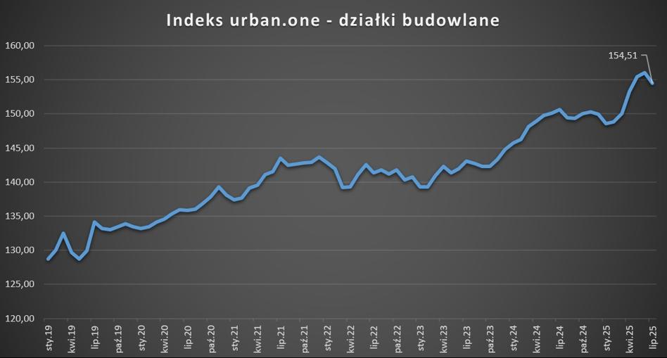 Odmienną od obserwowanej w ostatnim czasie sytuację można było zaobserwować w lipcu w przypadku działek budowlanych. Odczyt indeksu wyniósł 154,51 pkt i był o 1,5 pkt niższy niż w czerwcu, ale jednocześnie o blisko 4 pkt wyższy niż przed rokiem.