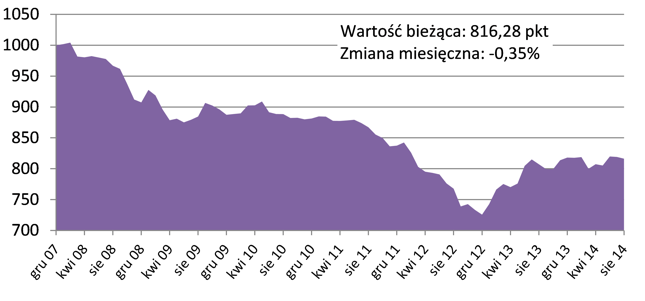 Pięć kwartałów trwa już stabilizacja notowań Indeksu Cen Transakcyjnych Home Broker i Open Finance, obrazującego sytuację na rynku nieruchomości wskaźnika, który powstaje na podstawie transakcji na rynku nieruchomości dokonywanych przez klientów obu firm. Od 15 miesięcy ICT przebywa w przedziale 800-820 punktów. Najnowszy odczyt to 816,28 pkt, czyli o 0,35 proc. mniej niż przed miesiącem i o 1,1 proc. więcej niż w sierpniu ubiegłego roku. Indeks liczony jest od początku 2008 roku, od tego czasu spadł o 18,4 proc. Na rynku swoje piętno odcisnęły wakacje, liczba transakcji uwzględnionych do wyliczania indeksu w ciągu miesiąca spadła o 3,8 proc.