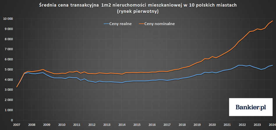 Oznacza to, że realny wzrost cen 1 mkw. powierzchni mieszkaniowej w 10 polskich miastach przez ostatnie 5 lat podniósł się o 20,2%, a przez poprzednie 10 lat o 46,4%. Implikuje to realną średnioroczną stopę wzrostu rzędu 3,75% w okresie ostatnich 5 lat oraz 3,89% w przypadku okresu 2014-24. Przy czym realna dynamika cen mieszkań przyspieszyła dopiero po roku 2018. Co więcej, po skorygowaniu o inflację CPI cena 1 mkw. mieszkania na rynku pierwotnym dopiero w poprzednim kwartale pobiła rekordy z przełomu lat 2021/22.