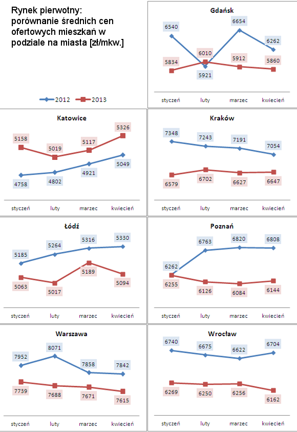 Katowice: Na katowickim rynku pierwotnym co najmniej od początku 2012 roku panuje trend wzrostowy. Spadek nastąpił w lutym 2013 roku. W tym roku w porównaniu do poprzedniego lokale były oferowane po cenach wyższych – odpowiednio o 400, 220, 200, 280 zł/mkw.