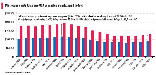 Podręcznikowo rzecz traktując ujemny (i to od lat) bilans w obrotach handlowych jest szkodliwy; tak jednak jest zawsze w gospodarce zamkniętej. W gospodarce globalnej tandem Chimeryki do czasu kryzysu jakoś działał. Przede wszystkim cieszył on Chiny, bo umożliwiał Państwu Środka ogromny eksport. Dla USA natomiast płacenie dolarami, które natychmiast były absorbowane przez Chiny i powiększały chińskie rezerwy, nie było problemem. Ba, w amerykańskiej gospodarce (obecnie w recesji), sam fakt powiększania się importu i deficytu – co odnotowano w ostatnich miesiącach – został oceniony jako pozytywny symptom, świadczący o zwiększeniu obrotów na rynku wewnętrznym, a więc wychodzenia z recesji (rys. 1). Z kolei dla gospodarki światowej obecnie im więcej Stany Zjednoczone kupują i konsumują – a więc praktycznie im więcej importują – tym lepiej.