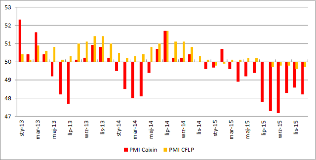 Wskaźnik publikowany przez Markit i Caixin tradycyjnie różni się od „państwowego” PMI sporządzanego przez Narodowe Biuro Statystyczne i Chińską Federację Logistyki i Zaopatrzenia (CFLP). Indeks ten zatrzymał się w grudniu na poziomie 49,6 pkt. i dzięki wzrostowi o 0,1 pkt. odbił się od najniższego poziomu od sierpnia 2012 r.