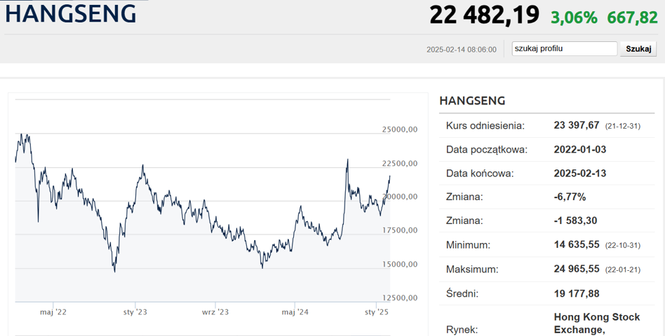 O godzinie 8:00 w piątek główny indeks giełdy w Hongkongu, czyli Hang Seng zyskiwał 3,06 proc. Jego zwrot od początku roku sięga już natomiast 16 proc. Tym samym Hang Seng zbliża się do ubiegłorocznego szczytu, do którego brakuje mu 2,75 proc. Jeśli uda mu się go pokonać, znajdzie się najwyżej od lutego 2022 roku.