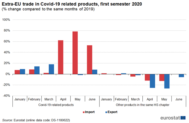 Inne dane Eurostatu pokazują rozkład handlu produktami "związanymi z COVID-19" w pierwszej połowie 2020 roku. Początkowo z krajów UE rósł eksport, jednak w kwietniu nastąpił gwałtowny skok importu. To właśnie wtedy unijne kraje na masową skalę zaczęły wprowadzać obostrzenia związane z pandemią.