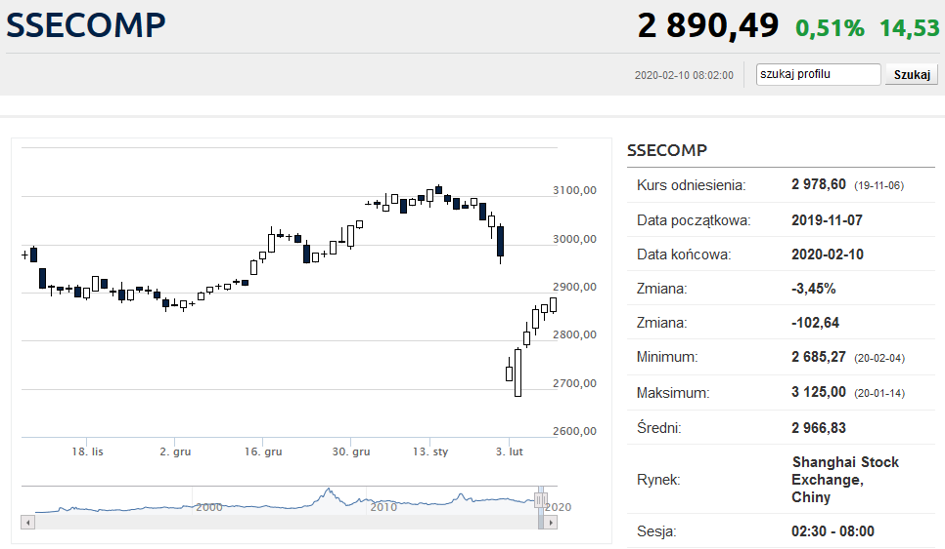 Przed tygodniem, gdy handel na parkietach w Szanghaju i Shenzhen został wznowiony po świątecznej przerwie, inwestorzy "nadrabiali straty" w stosunku do innych światowych giełd przez kilka dni dyskontujących niepewność związaną z rozprzestrzenianiem się koronawirusa za Murem. Główne chińskie indeksy zanurkowały w ubiegły poniedziałek po ok. 8 proc.