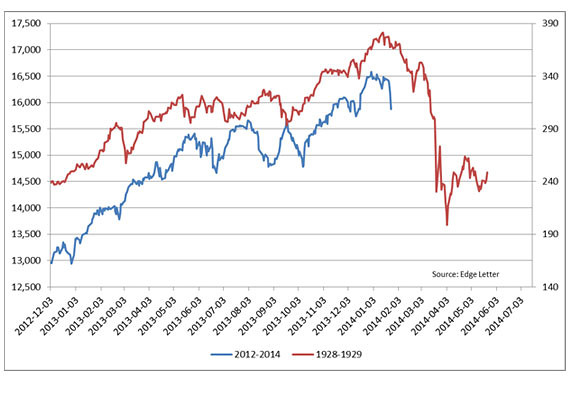 Dow Jones z lat 2012-13 na tle swej trajektorii z lat 1928-29
