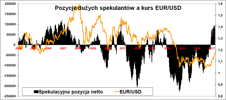 A gdy nie wiadomo, o co chodzi, to niemal zawsze chodzi o pieniądze. W tym momencie chodzi o naprawdę duże pieniądze, jakie duzi gracze postawili na dolara w ubiegłych dwóch latach. Po grudniu ’16 potężna krótka spekulacyjna pozycja netto w kontraktach na euro zaczęła być zamykana. Im dłużej eurodolar nie chciał zejść poniżej 1,05, tym mniej było chętnych na grę przeciwko wspólnotowej walucie. Do przełomu doszło na początku maja (czyli po wyborach we Francji), gdy krótka spekulacyjna pozycja na eurodolarze zamieniła się w długą. Mało tego, w ciągu kilku tygodni osiągnęła ona największe rozmiary od czterech lat!