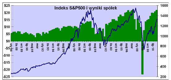 W pierwszym kwartale indeks S&P500 „zarobił” 21,60 USD, co było drugim najwyższym wynikiem w jego historii. Analitycy prognozują rekordowe zyski na trzeci kwartał tego roku, a następnie stabilizację na wysokim poziomie w całym roku 2012. Bazując na historycznych wynikach z ostatnich czterech kwartałów, spółki z indeksu S&P500 są wyceniane średnio na 16,5-krotność zysków netto. Jeśli wziąć pod uwagę prognozy na następne 12 miesięcy, to relacja ceny do zysku maleje do 13,6.